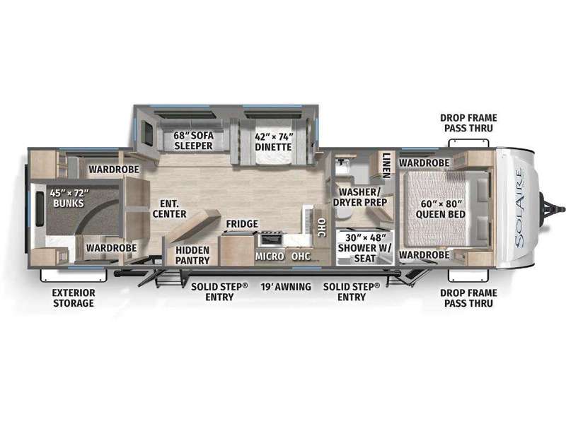 Each SolAire travel trailer by Palomino features a white gel coat exterior and an aluminum superstructure frame for lightweight towing. You will love having a power tongue jack for easy set up, plus slam latch baggage doors with magnets to make unloading easier than ever. There is also a power awning with LED lights and aluminum wheels included on the exterior. Each SolAire is constructed to last with Azdel composite, a fully laminated rear wall and roof, plus a fully enclosed and heated underbelly. The interior includes roller shades and kitchen backsplash, USB ports to keep your electronics charged, a Bluetooth stereo with speakers, and many more stand-out features!