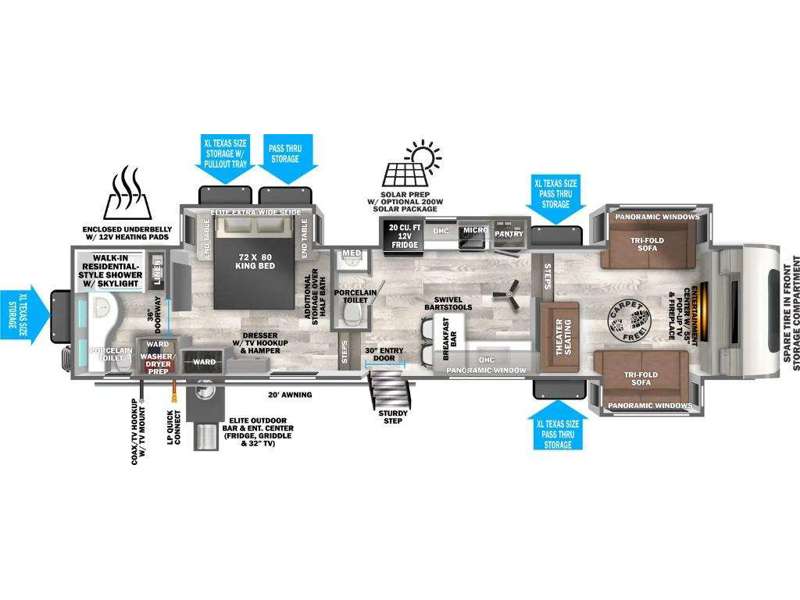 - Extra Large Pass Thru Storage w/ Slam Latch Baggage Doors