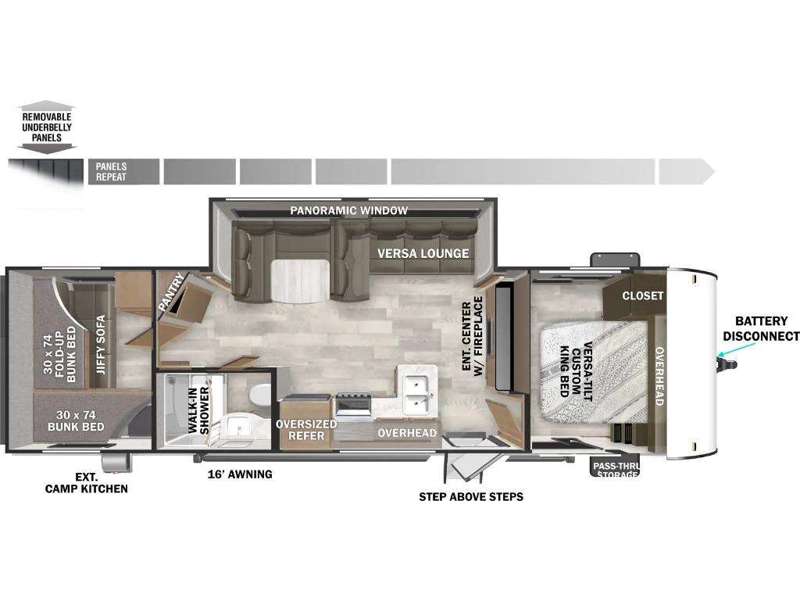 If you like to travel with a large crew, choose this Wildwood X-Lite travel trailer! This trailer has two private sleeping spaces with a private bedroom up front and a private bunkhouse in the back. Not only does the bunkhouse have three bunk beds, but it also has a closet for storage and a jiffy sofa for lounging. In the main living area, there is a large slide that holds the U-shaped dinette and sofa. These pieces of furniture are a part of the Versa Lounge, and you can customize them to function as you need them to. The panoramic windows surround the dinette and sofa so that you can take in the scenic views while you relax. You even have an outdoor camp kitchen to make it more convenient.