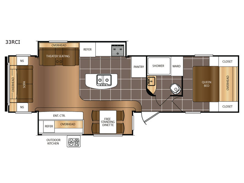 This Prime Time Avenger travel trailer 33RCI features a spacious living area with dual opposing slide outs, a convenient kitchen island, a private front bedroom, and an outdoor kitchen to enjoy!
