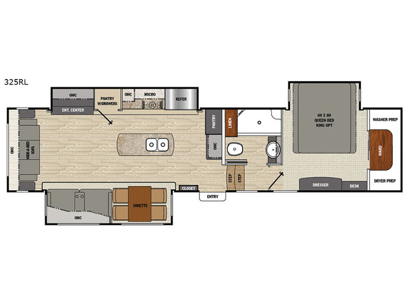 In the very rear of the unit there is a hide-a-bed sofa with end tables and overhead storage the entire width of the fifth wheel. There is an entertainment center in the slide opposite the door side slide adjacent to the sofa. This slide also features the kitchen amenities as well. You will find a pantry space with drawers, a refrigerator, a three burner range with overhead microwave, plus counter space and storage above it.
