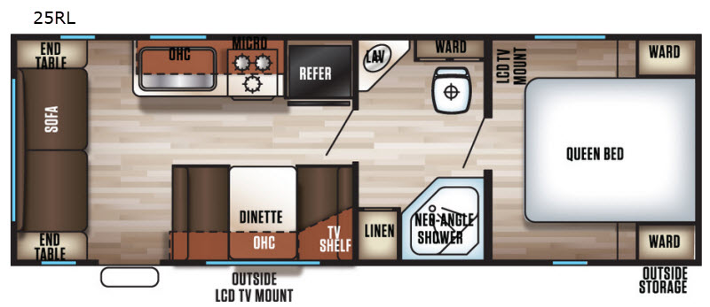 Enjoy your time exploring and sightseeing knowing that your home base set up back at camp will take care of you with plenty of space to relax. Hit the sofa after a fun-filled day for a break to rest or to enjoy a good book. The kitchen offers everything you need to cook up some yummy meals when you get hungry. And, for ultimate relaxation when you just need to get re-energized, jump in the neo-angle shower then head to bed where you will get a great night's sleep on the queen bed up front. The pass-through bath is quite spacious as you have the entire width of the trailer included. You will also find that there is ample storage for your things between bedside nightstands and wardrobes, overhead cabinets throughout, as well as outside storage too!