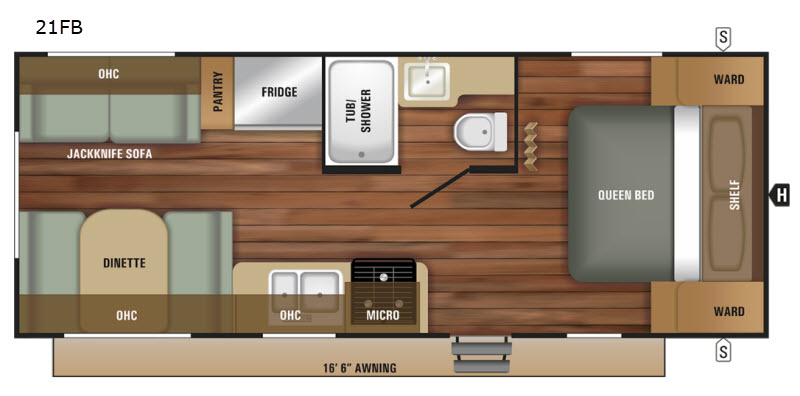 When you are ready to get up and go then you will want this easy to tow Autumn Ridge Outrigger 21FB travel trailer. In the rear you can come visit with your family at the jack knife sofa and the dinette. In the front area there is a queen bed and an accordion door which you can easily close for privacy. In the kitchen you can store your perishables in the large refrigerator and your canned goods can be stored in the pantry. The 16'6" awning is a nice shaded area where you can relax during the day while watching your kids play outside.