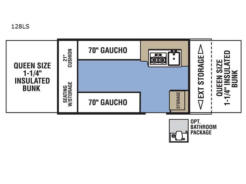 When you enjoy the outdoors yet prefer indoor amenities being available, this folding pop-up makes sense! You can cook meals, brush your teeth, and relax inside as well as sleep six when you utilized both gauchos and tent end beds. The additional seating with storage and cushion can create U-shaped seating with the gauchos. And the exterior storage will come in handy for your outdoor gear. There is a bathroom package available in place of storage if you decide to add that option. And you can choose the optional Off-Road package offering 15" off-road tires and a spare, plus length stabilizing extended jacks and more!